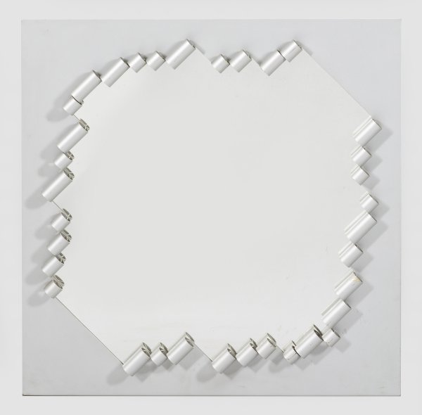 Aluminium, grau lackiert. Quadratische Spiegelrahmung mit großer Reserve, umgeben von eingerollten Aluminiumbahnen. Unbez.; 72 cm x 72 cm.