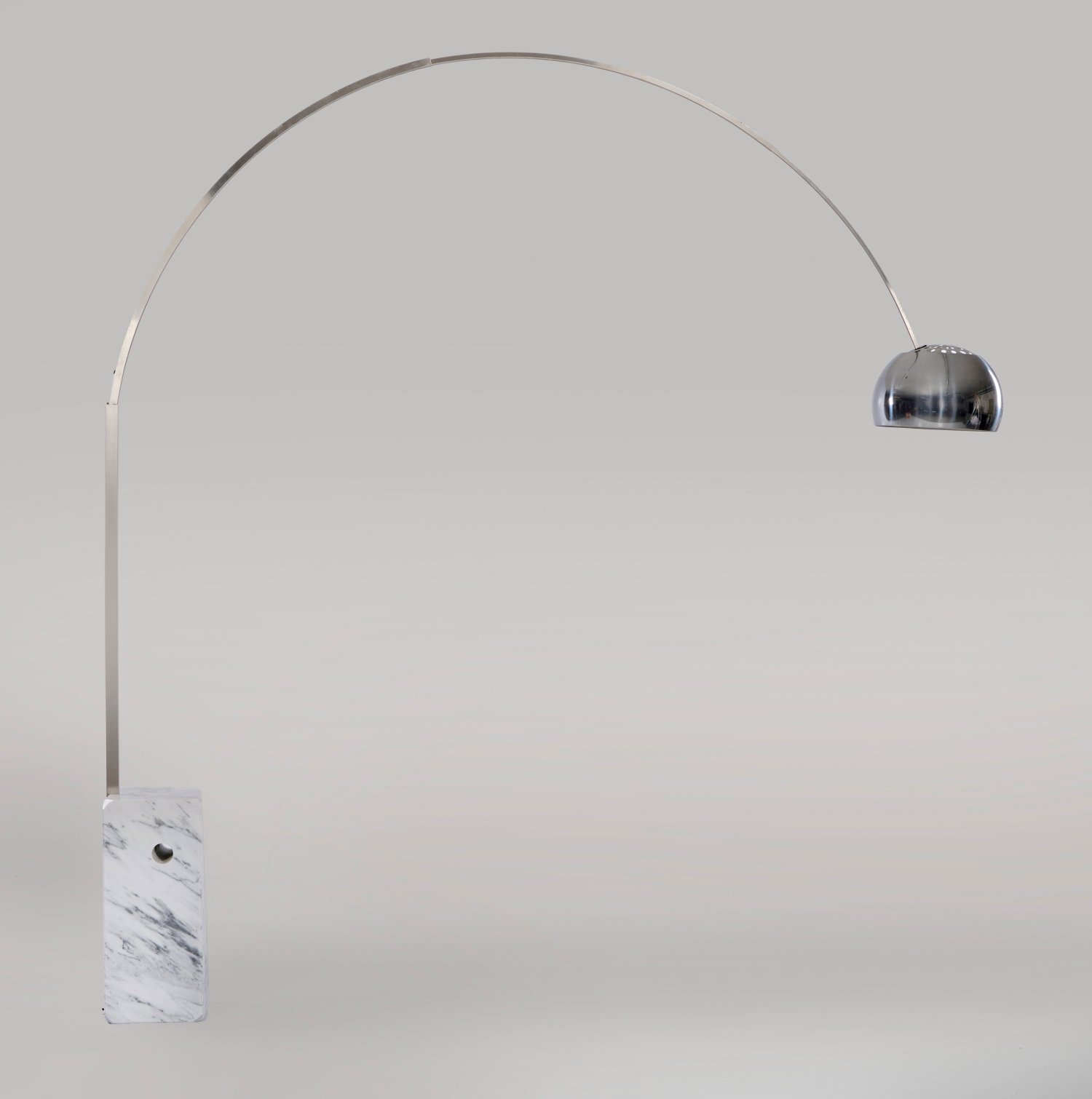 1-flg.; Weißer, hellgrau gemaserter Marmor sowie Metall, verchromt. Über hochrechteckigem Podestsockel mit runder Aussparung schlanker, weit ausschwingender, gekanteter Schaft als Träger für Leuchtmittel in Form eines runden Lampenschirms. Herstellerzeichen. Elektrifiziert. Entw. Achille & Pier Giacomo Castiglioni, 1960er Jahre. H. 250 cm.