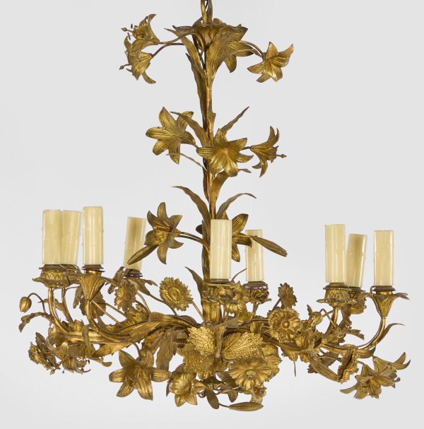 9-flg.; Messing. Schlanker, vegetabil gestalteter Schaft aus Lilienblüten. Unterhalb davon ausgehend entsprechende, leicht geschwungene Leuchterarme mit Astern sowie mit zylinderförmigen Tüllen. Elektrifiziert. H. 58 cm. D. 51 cm.