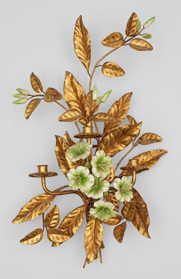 3-flg.; Metall, vergoldet bzw. teilw. grün-weiß lackiert. Wandschild in Form eines üppigen Bündels aus Blattwerk und Blütenzweigen. Davon ausgehend stark geschwungene Leuchterarme mit zylinderförmigen Tüllen. H. 64 cm.
