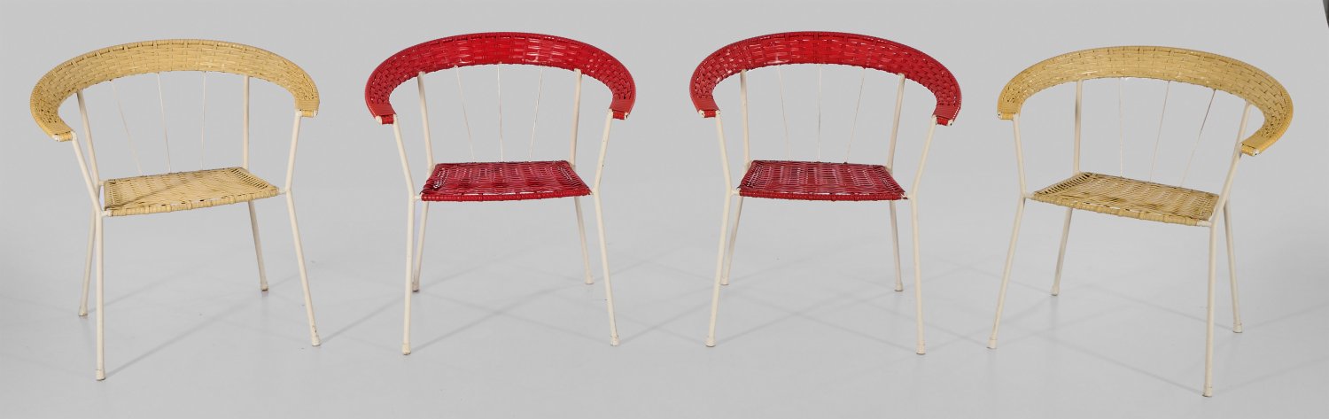 Metall, weiß lackiert sowie rote und cremefarbene Gummischnur. Filigran gestaltetes Gestell aus schräggestellten Rundstäben. Flache Sitzfläche und stark gerundete Rückenlehnen aus geflochtenen Bändern. Unbez.; H. 73 cm. 68 cm x 50 cm. Sitz-H. 42 cm.