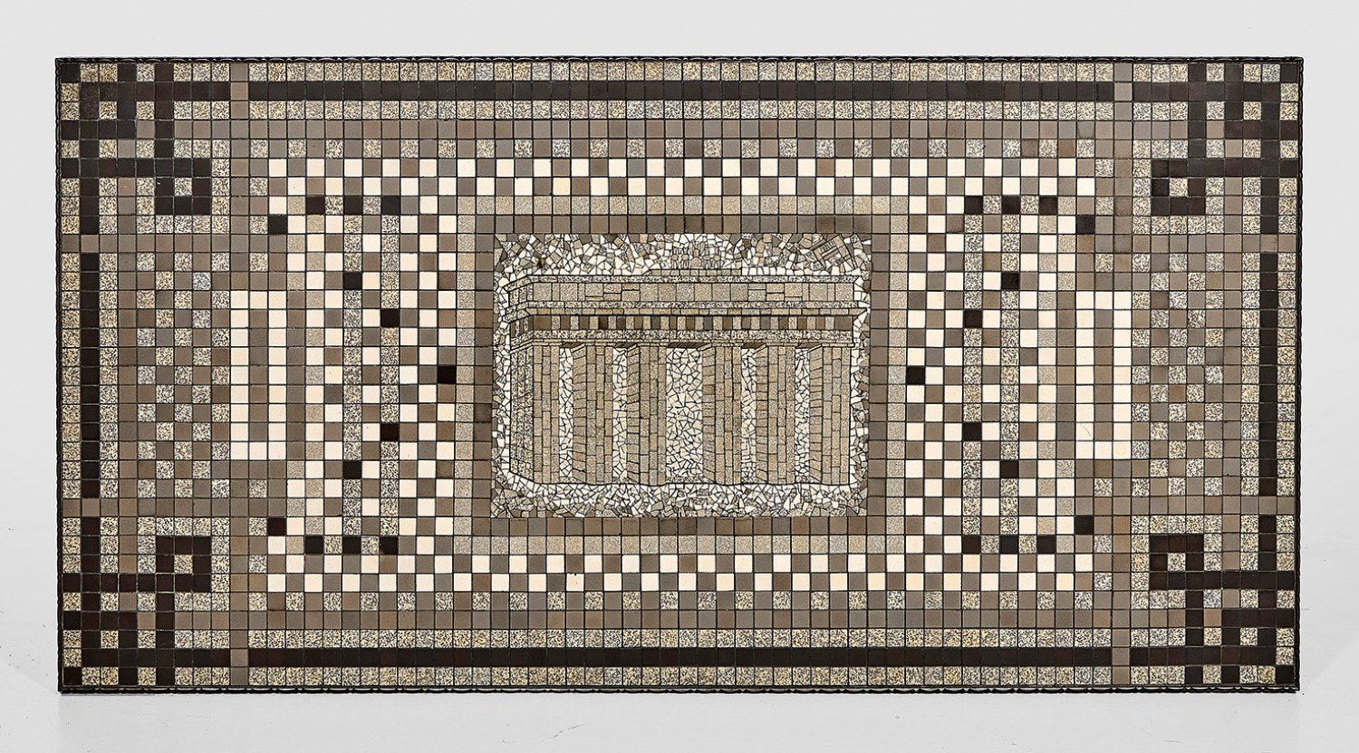 Schmiedeeisen, geschwärzt sowie kleine Fliesenquadrate in unterschiedlichen Grautönen, schwarz und weiß. Über flachen Kufen, durchbrochen gestaltete, schildförmige Seitenwangen aus zentraler Kartusche mit dem Berliner Bären, umgeben von üppigen, eingerollten Voluten. Rechteckige, profilgerahmte Deckplatte. In der Mitte zentrale Reserve mit der Darstellung des Brandenburger Tors, umgeben von Mäanderband. H. 67 cm. 141 cm x 71 cm.