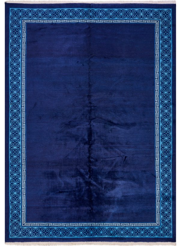 China. Wolle auf Baumwolle. Monochromes, tintenblaues Innenfeld. Umlaufend schmale Mäanderrahmung sowie breite Bordüre mit Mosaikmuster in zweifarbigem Blau. 190 cm x 264 cm.