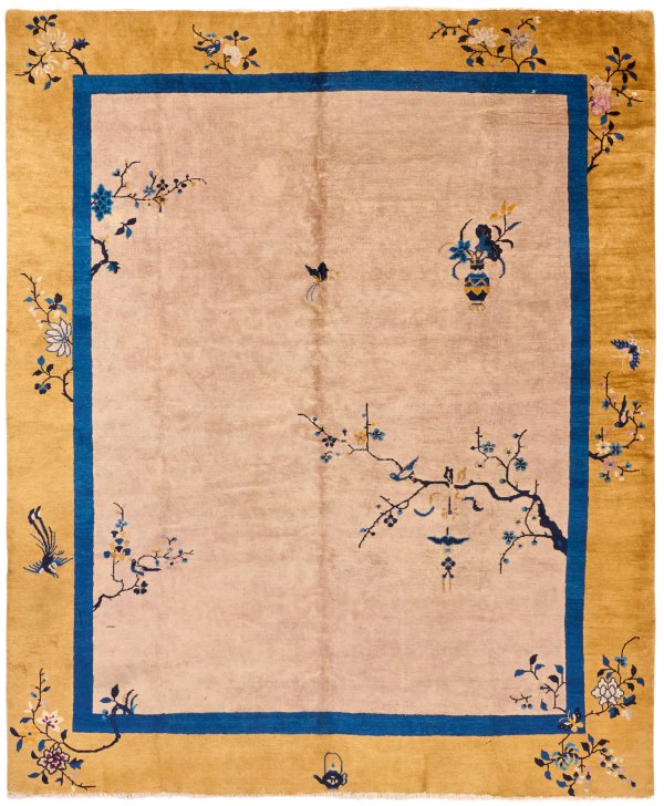 China. Um 1920. Wolle auf Baumwolle. Im beigefarbenen, monochromen Innenfeld Musterung aus zarten Blütenzweigen, Vase und Schmetterling, begrenzt von blauer Rahmung. Umlaufend goldgelbe Bordüre mit Blütenzweigen und Phönix. 300 cm x 260 cm.