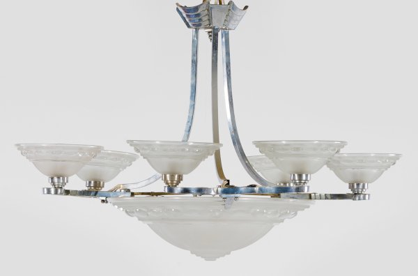 6-flg.; Metall, vernickelt und farbloses, satiniertes Glas. Flache, facettierte Lampenschale als Träger für breite Stege mit entsprechenden Leuchtmitteln. Oberhalb davon ausgehend Aufhängung aus gekanteten, geschweift ansteigenden Streben. Innen eine weitere Lampenfassung, elektrifiziert. H. 50 cm. D. 75 cm.