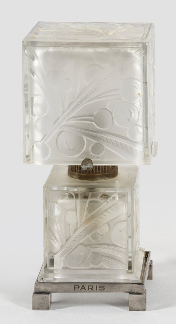 1-flg.; Farbloses, in die Form geblasenes und teilw. satiniertes Glas. Über schmalem Zargensockel und gekanteten Füßen würfelartiger Korpus mit flächendeckendem Reliefdekor aus stilisierten Kirschen als Träger für Leuchtmittel. Innen zusätzliche Lampenfassung. Korrespondierender, gering überstehender Lampenschirm. Sockel bez. Sabino. Paris. Elektrifiziert. Minim. best.; H. 24,5 cm.