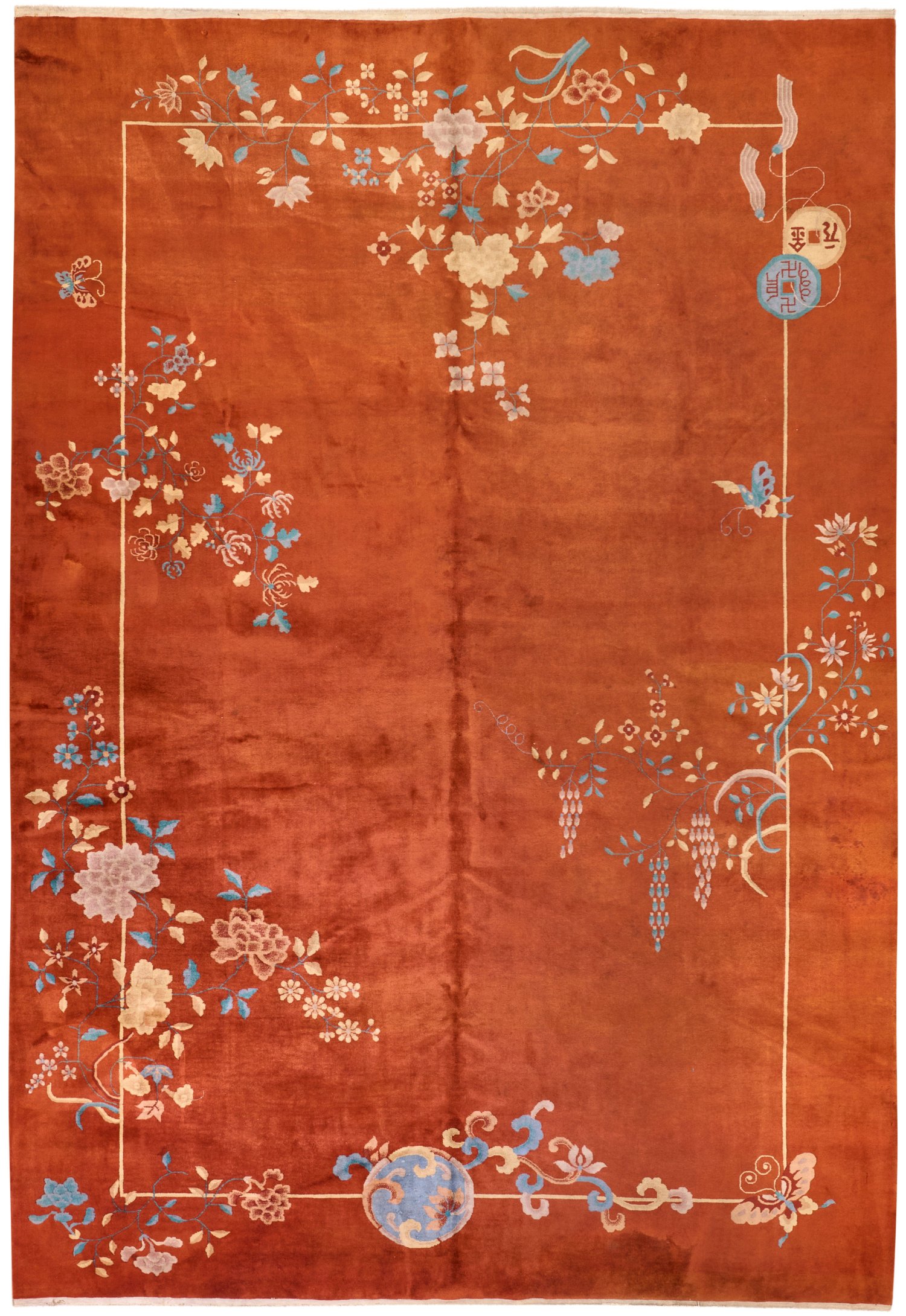 China. Mitte 20. Jh.; Wolle auf Baumwolle. Auf monochromem, eisenrotem Fond schmale, hellgelbe Rahmung mit großzügig angelegten Blütenzweigen aus Päonien und Blauregen in Hellgelb- und Hellblautönen. Tondos mit Kalligraphie. 435 cm x 296 cm.