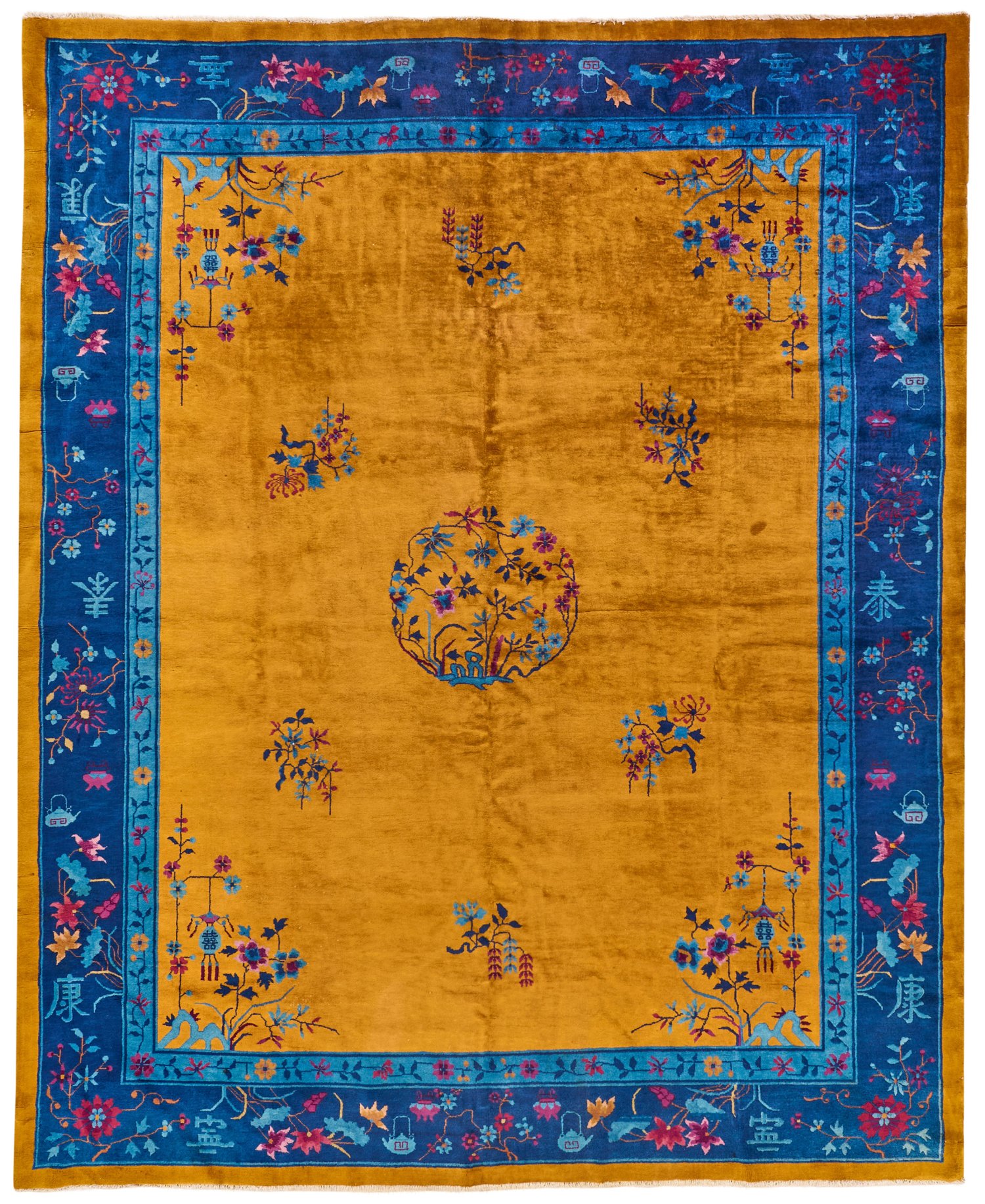 China. 1. Hälfte 20. Jh.; Wolle auf Baumwolle. Im safranfarbenen, monochromen Innenfeld offen gestaltetes Zentralmedaillon aus Blütenzweigen sowie korrespondierende Ecklösungen mit Lampions. Musterung aus gestreuten Blüten. Umlaufend breite Bordüre in zweifarbigem Blau mit entsprechendem Blütendekor. 342 cm x 282 cm.