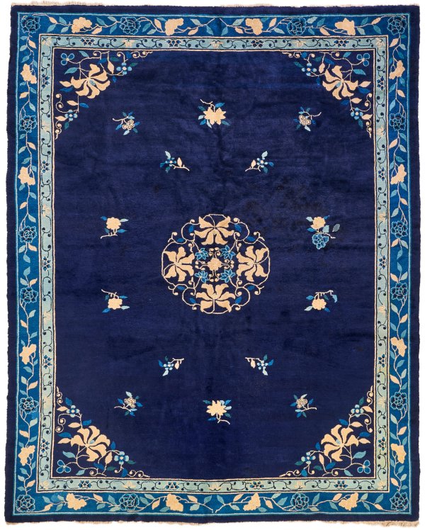 China. Mitte 20. Jh.; Wolle auf Baumwolle. Im tintenblauen Innenfeld Zentralmedaillon aus zentriert angeordneten Blüten. Korrespondierende Ecklösungen sowie Musterung aus losen gestreuten Blüten. Umlaufend mehrteilige Bordüre aus Rankenwerk in unterschiedlichen Blautönen. 353 cm x 280 cm.