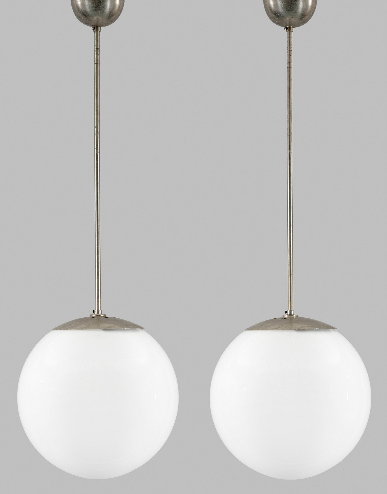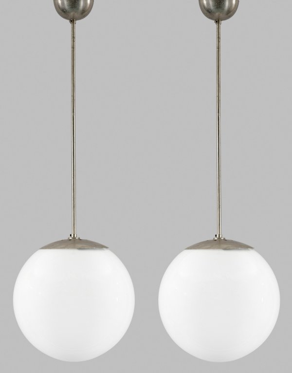 A pair of German glass and metal Art Deco ceiling lamps. Signs of age.