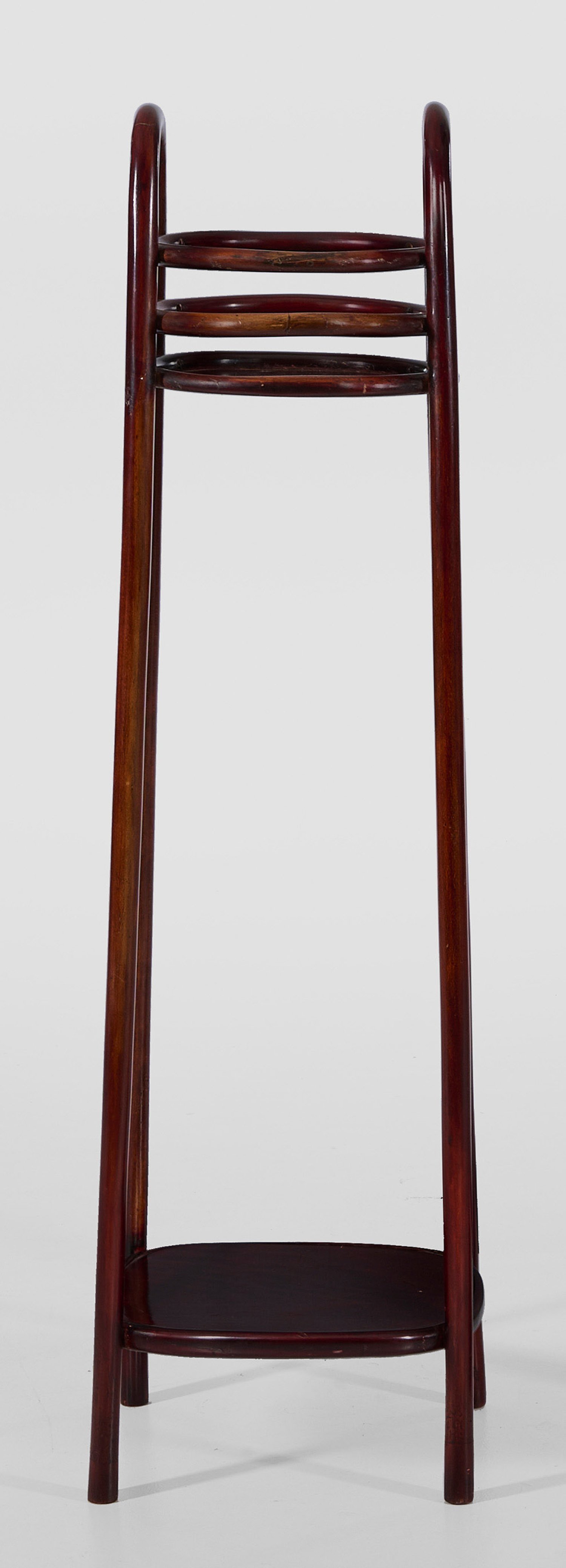 Modell No. 1009. Buchenholz, mahagonifarben gebeizt. Gestell aus stark gebogten Rundstäben und gegeneinander gestellten Streben als Träger für gestaffelt angeordnete, gerundete Ablageflächen. Unbez; H. 130 cm.
