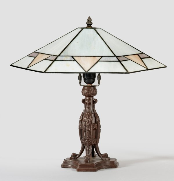 1-flg.; Metall dunkelbraun lackiert sowie weißes und roséfarbenes, marmoriertes Glas. Über konkav eingezogener Sockelplatte balusterförmiger, flächendeckend reliefierter Korpus als Träger für Leuchtmittel. Flacher, gekanteter Lampenschirm mit Bleiverglasung. Elektrifiziert. Besch.; H. 44 cm.