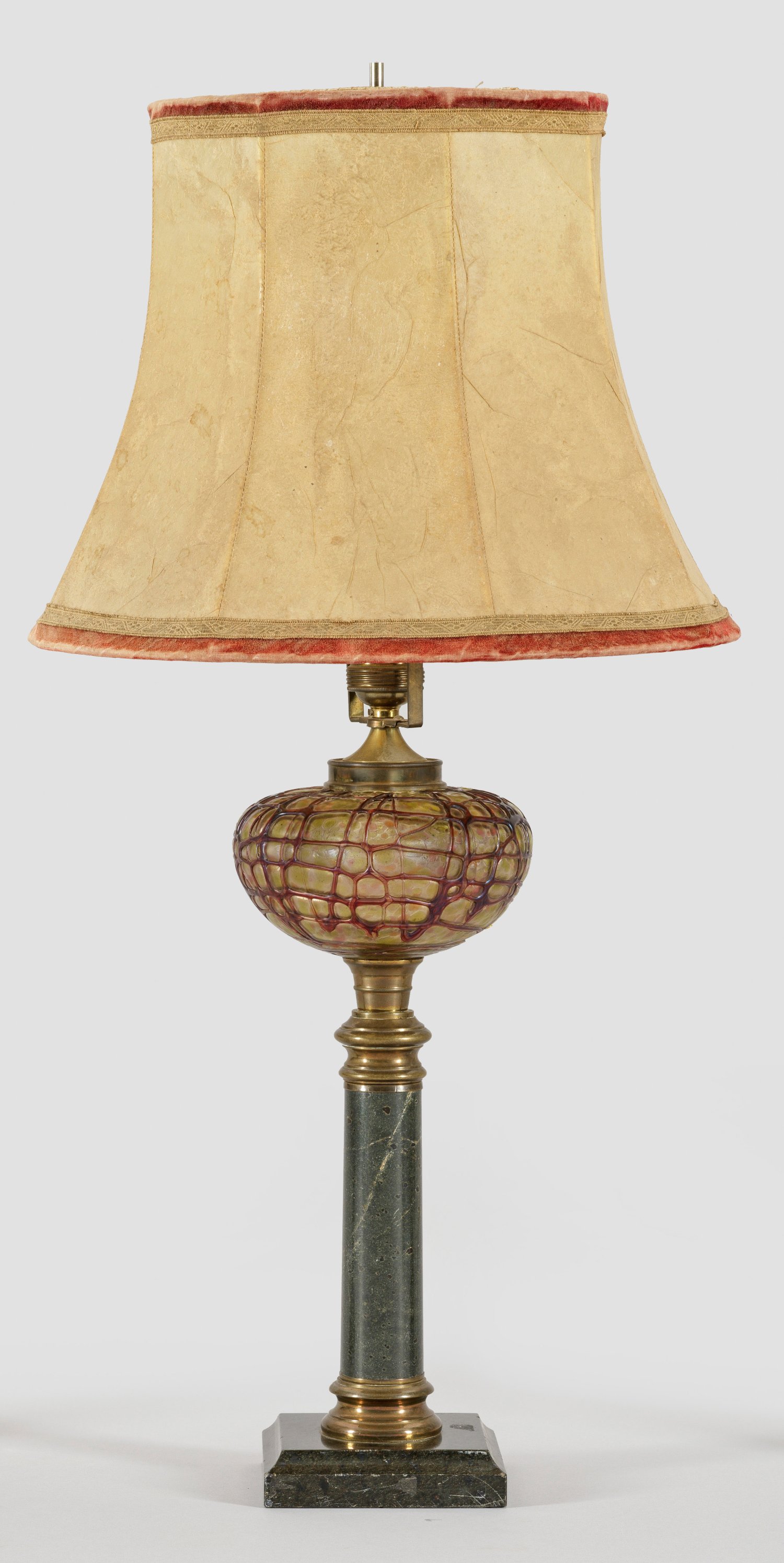 1-flg.; Grün gemaserter Serpentin, Messing sowie gelbliches Glas mit roséfarbenen Ein- und bordeauxroten, gitteratig angelegten Aufschmelzungen. Über quadratischer Plinthe leicht konischer Säulenschaft mit reliefierter Basis und entsprechendem Kapitell. Oberhalb Balusterelement als Träger für Leuchtmittel. Lampenschirm. Später elektrifiziert. H. 68 cm.