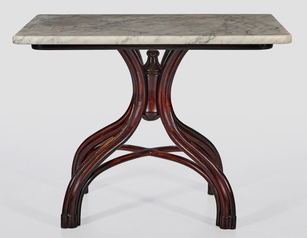 Buchenholz, mahagonifarben gebeizt und weißer, hellgrau gemaserter Marmor. Gestell aus stark geschwungenen, gebündelt angeordneten Bugholzstäben, unterhalb durch gebogte Stäbe verbunden. Kräftige, rechteckige Deckplatte mit gerundeten Ecken. Unbez.; Entw. der Basis Adolf Loos, 1898 für das Café Museum. H. 75,5 cm. 100 cm x 65 cm.