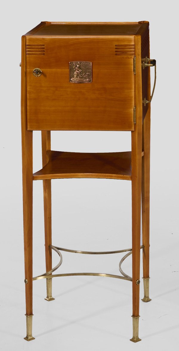 Ahorn. Kubenartiger, eintüriger Korpus, flankiert von schräggestellten Ecklisenen, in hohe konische Vierkantbeine mit Messingschuhen übergehend. Unterhalb eingezogenes Ablagefach sowie schmale gebogte Messingstege. H. 100 cm. 38 cm x 38 cm.