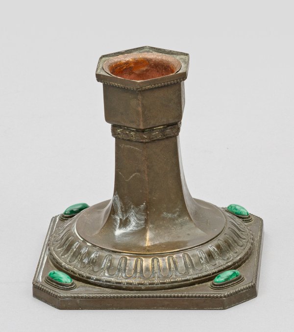Gelbguss, patiniert sowie grün gemaserte Glascabochons. Über flacher Basis mit feinem Perlstabfries geschweift ansteigende Basis mit Zungenfries, in gekanteten Schaft übergehend. Oberhalb korrespondierende Tülle. H. 13,5 cm.