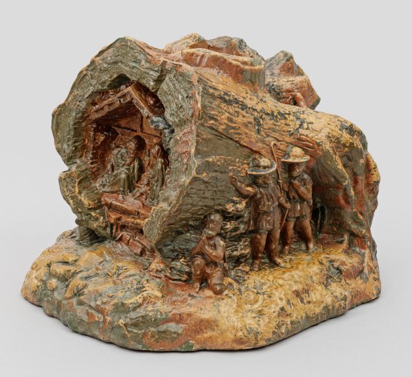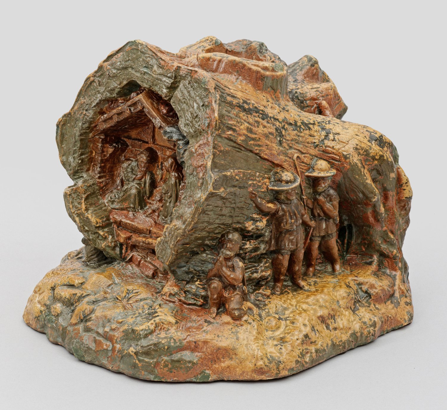 Keramik, beige-grün staffiert. Über naturalistisch gestaltetem Sockel großer Baumstumpf. Schauseitig darin eingelassene Darstellung einer Krippenszene sowie Hirten. Auf der Rückseite schlafende Wichtel. Oberhalb Aussparung für kleinen Weihnachtsbaum. H. 25 cm. 35 cm x 30 cm.