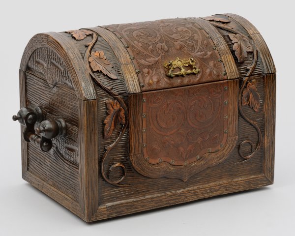 Holz, reliefplastisch geschnitzt und dunkel gebeizt. Querrechteckig angelegter Korpus mit hochgewölbtem Runddeckel. Flächendeckend relifierter Maserdekor sowie geschwungene Weinreben. In der Mitte breite Reserve aus geprägtem, braunem Leder. Rest.; H. 44 cm. 55 cm x 38 cm.