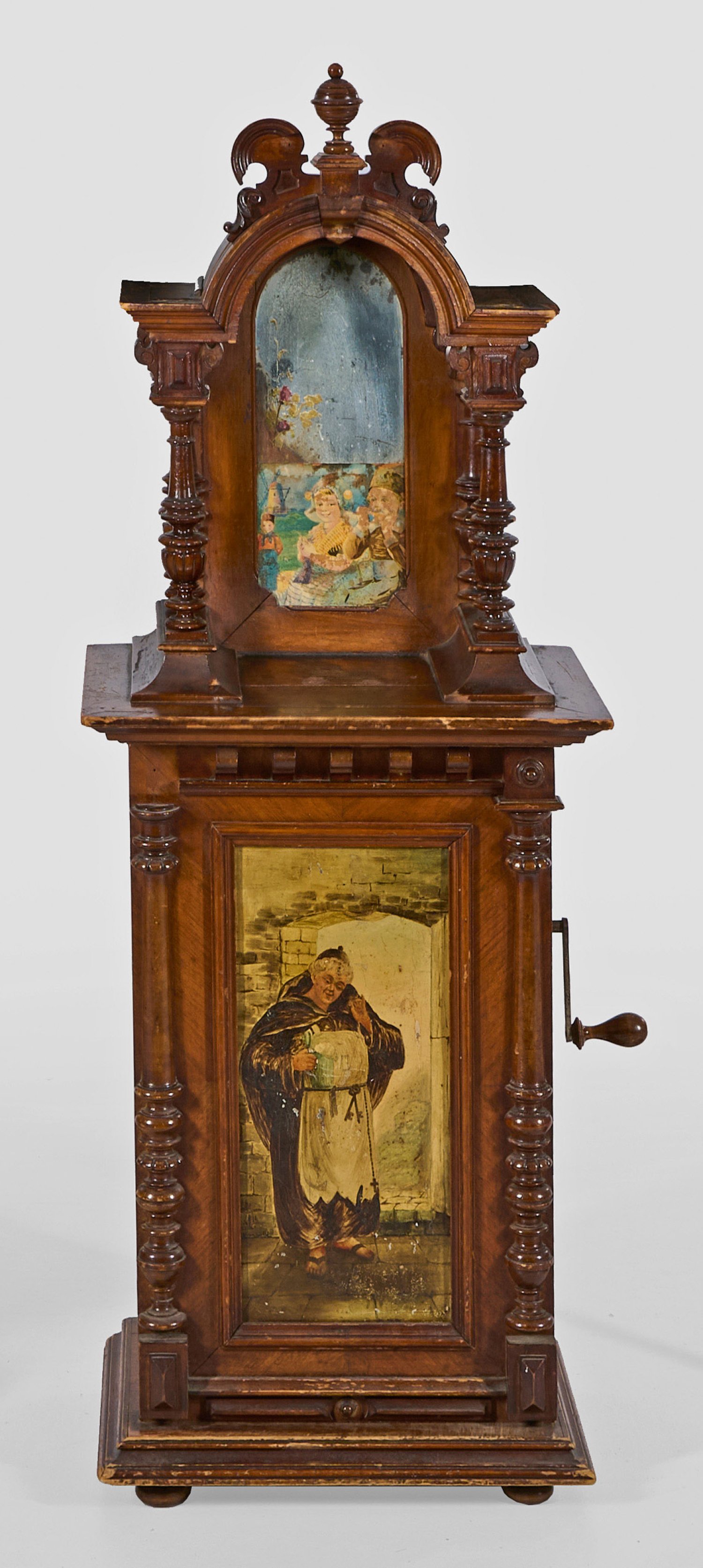 sog. Polyphon. Nussbaum, furniert und teilw. polychrom staffiert. Über flachem Profilsockel hochrechteckiger, eintüriger Korpus, flankiert von Halbsäulen. Weit überstehende Deckplatte sowie oberhalb offen gestalteter Aufsatz aus gegliederten Balustersäulen und Segmentabschluss. Seitlich Münzeinwurf für 10 Penni sowie Antriebskurbel. Spielwerk mit besch. Tonkamm, bez. Musterschutz. Gehäuse innen mit Stempel D.R.G.M. No. 46298. Dazu 18 Lochplatten. Stärkere Altersspuren. H. 135 cm.
