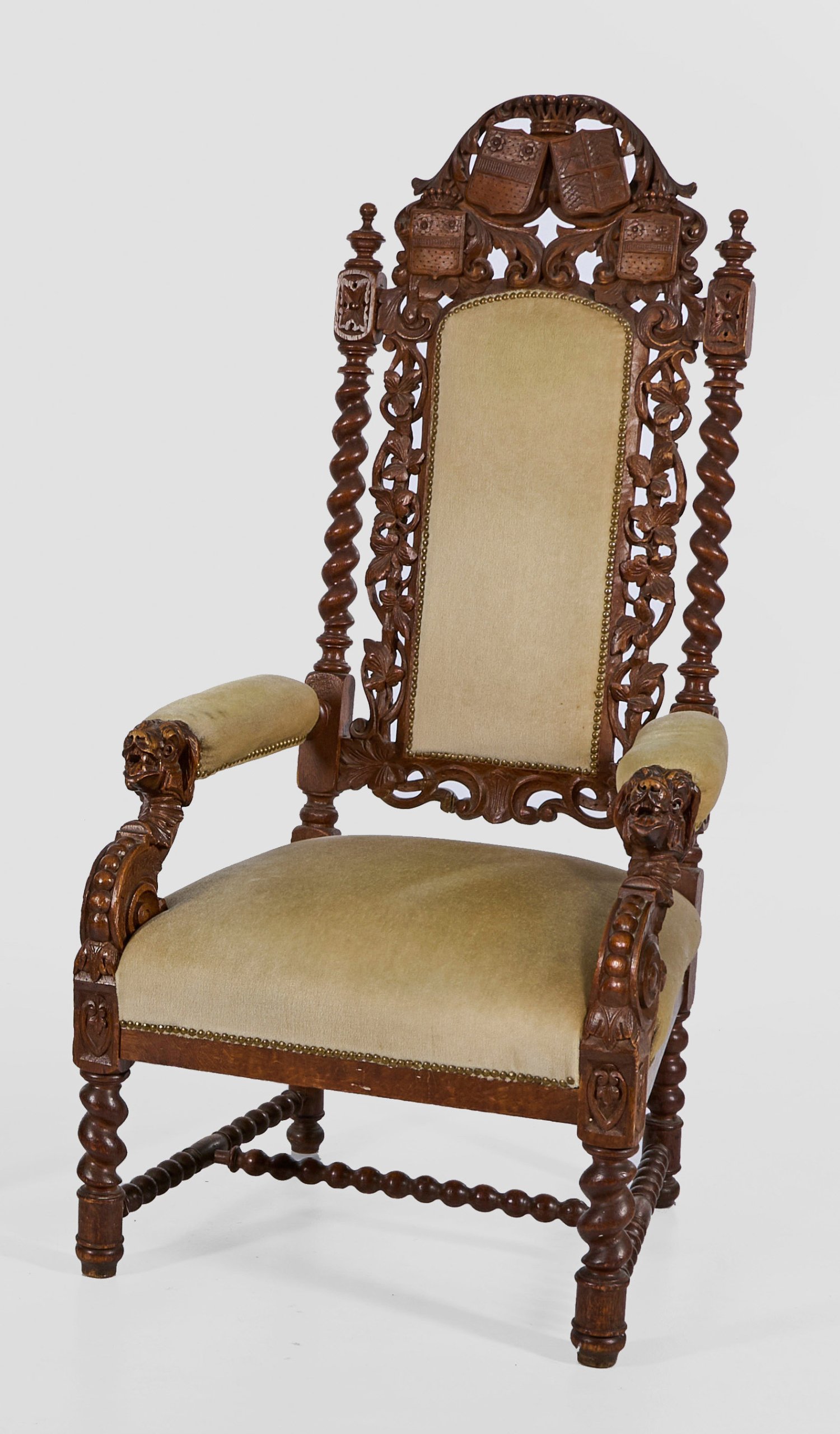 Eichenholz, reliefplastisch geschnitzt. Trapezförmige Zarge auf gedrehten Balusterbeinen, unterhalb durch schmale Stege verbunden. Volutenförmige Stützen mit plastisch gestalteten Hundeköpfen für breite Armlehnen. Hohe Rückenlehnenrahmung aus plastischen Weinranken, flankiert von gedrehten Säulen. Durchbrochen gearbeiteter oberer Abschluss mit Allianzwappen derer von Griesheim und Egmond van IJsselstein. Darüber Freiherrenkrone. Gepolstert und bezogen. Sitz-H. 45 cm.