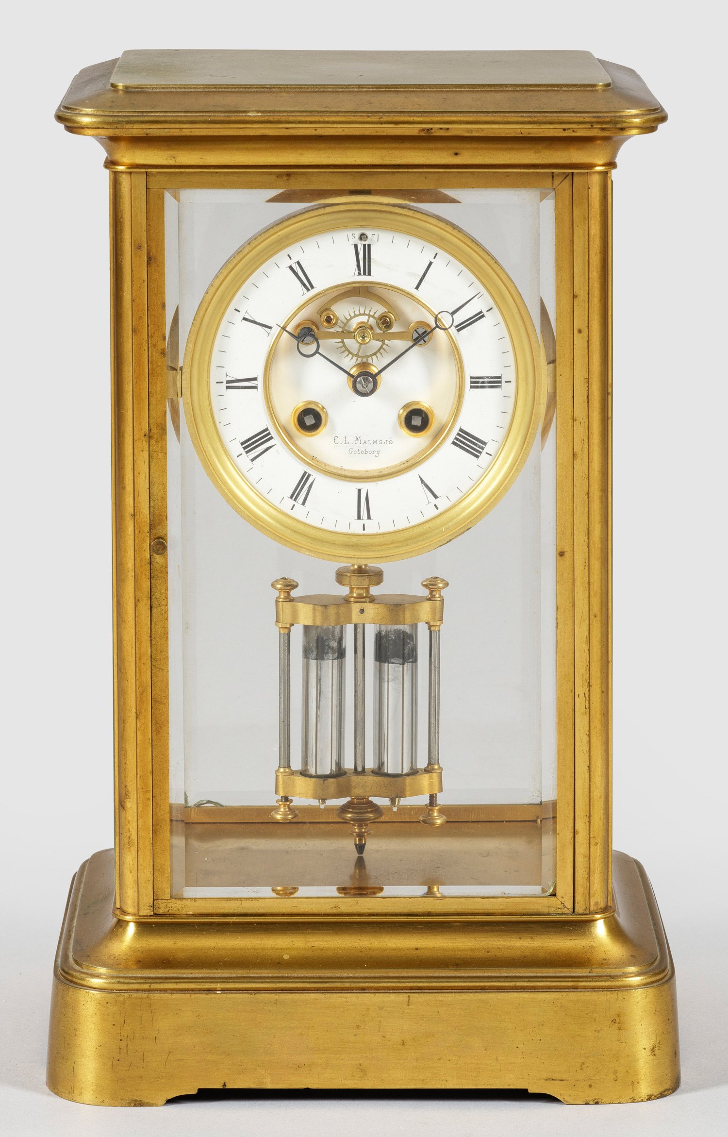 Messing. Allseitig facettverglaster Korpus mit Profilsockel und entsprechendem oberen Abschluss. Zifferblatt bez. C.L.Malmsjö Goteborg. Werk mit Ankerkemmung, Pendelfeder und Halbstundenschlag auf Glocke, bez. R&G Paris & London. H. 35,5 cm. 22 cm x 16 cm.