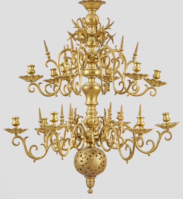 12-flg.; Bronze. Mehrfach gegliederter, teilw. ornamental durchbrochen gearbeiteter Balusterschaft als Träger für stark geschwungene, gestuft angeordnete Leuchterarme mit vasenförmigen Tüllen für blütenförmige Traufschalen. Oberhalb korrespondierende Blaker. H. 110 cm. D. 100 cm.
