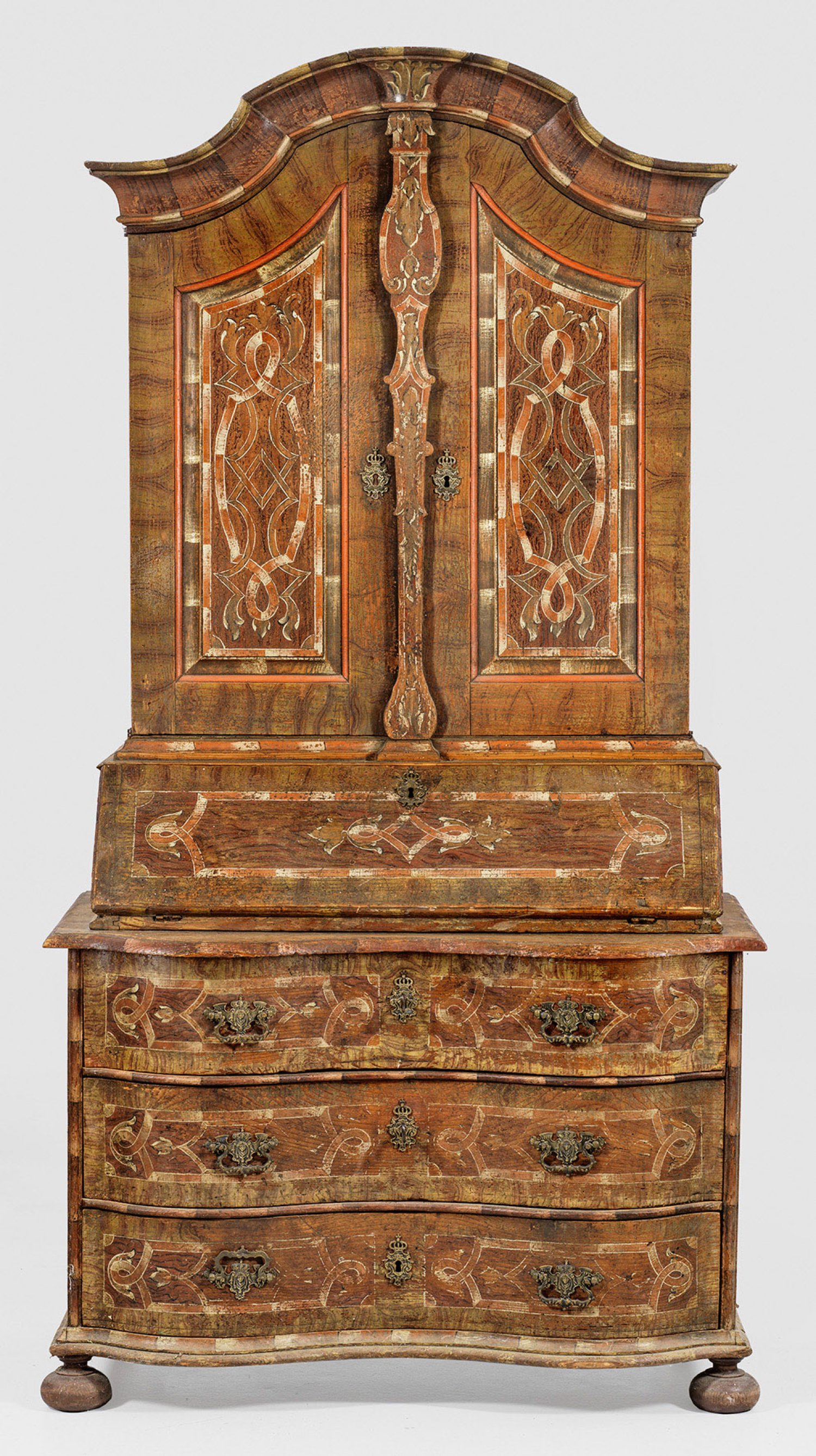 Weichholz, in Maseroptik gefasst und mehrfarbig bemalt. Gerader Korpus auf schmaler Profilzarge und gedrückten Füßen. In der gegliederten Front drei doppelt geschweifte Schubladen. Gering überstehende Deckplatte als Auflage für schräggestellte, abklappbare Arbeitsfläche. Korrespondierender, zweitüriger Aufsatz mit gekehltem, mittig hoch aufgeworfenem Kranzgesims. Flächendeckender Dekor aus gemaltem, üppigen Bandelwerk. H. 217 cm. 111 cm x 63 cm.