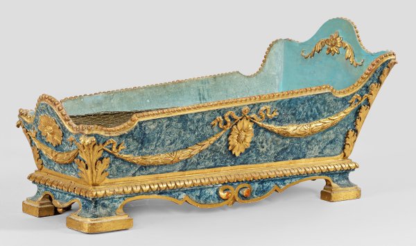 Holz, stuckiert, türkisfarben bzw. in blauer Marmoroptik gefasst und teilw. vergoldet. Sich konisch weitender Korpus einer Krippe mit hochaufgeworfenem Kopfteil und korrespondierendem Bettabschluss auf passig geschweifter Zarge aus gegeneinander gestellten Voluten und gerundeten Füßen. Allseitig erhaben reliefierter Dekor aus Blütenrosetten und Festons. Innen herausnehmbarer Messing-Einsatz sowie Blumensteckgitter. H. 28,5 cm. 59 cm x 27 cm.