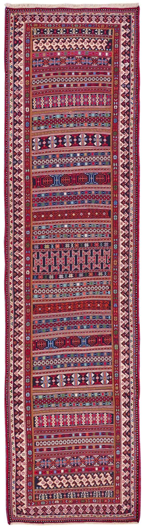 Persien. Wolle auf Wolle in sog. Sumak-Kelim-Technik. Im Innenfeld flächendeckende Musterung aus unterschiedlich ornamentierten Streifen. Umlaufend breite, vielteilige Ornamentbordüre. 288 cm x 74 cm.