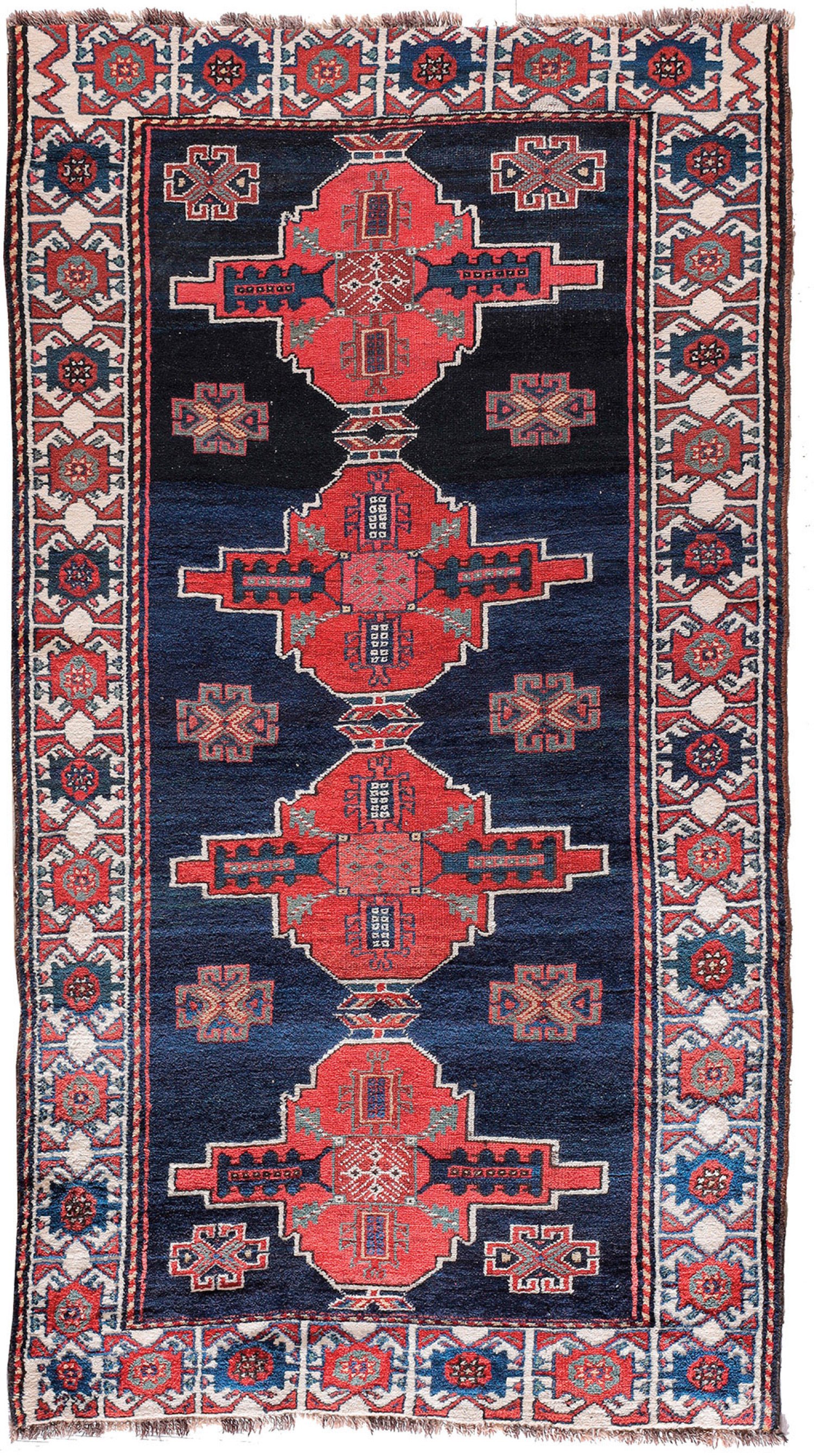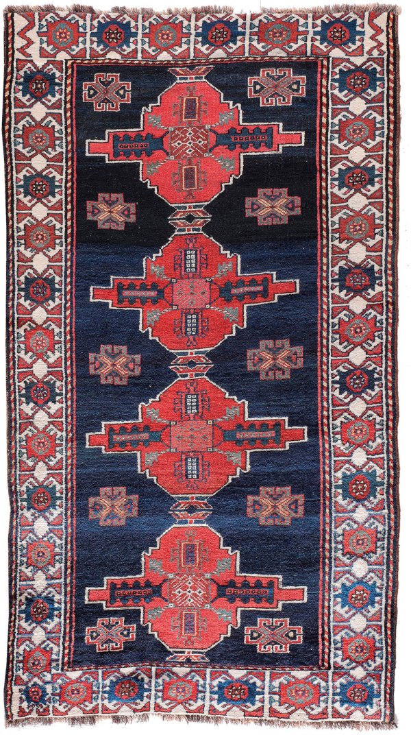 Wolle auf Wolle. Im dunkelblauen, leicht abraschierten Innenfeld vier große, rotgrundige Rautenmotive. Umlaufend breite, elfenbeinfarbene Ornamentbordüre. 203 cm x 113 cm.