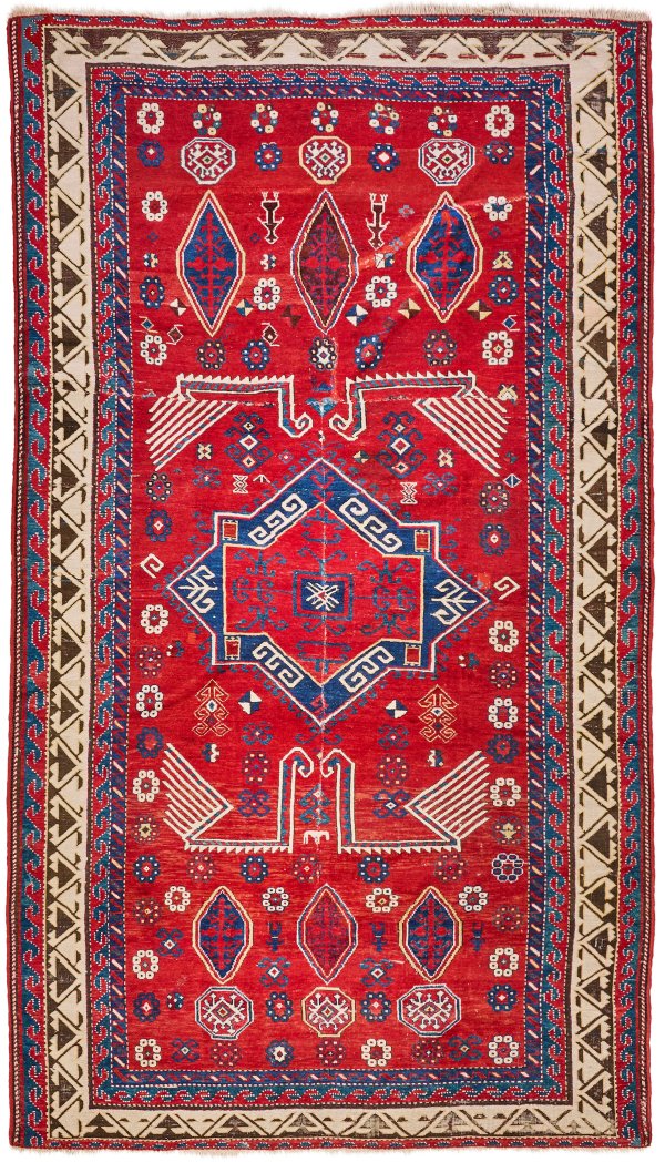 Kaukasus. 1. Hälfte 20. Jh.; Wolle auf Wolle. Im hellroten Innenfeld zentrales, blaugrundiges Rautenmotiv sowie flächendeckende Musterung aus Kartuschen, gestreckten Reserven und Blütenrosetten. Umlaufend breite, beigegrundige Bordüre, begrenzt von Wellenband. Rest.; 277 cm x 160 cm.