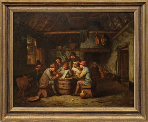 Motiv- und stiltypisches, stimmungsvolles Werk des Künstlers, der von Joseph De Cauwer und Ferdinand de Braekeleer ausgebildet wurde und mit Vorliebe ländliche Genreszenen und Jahrmarktmotive des 17. Jhs. in der Tradition von David Teniers und Adriaen van Ostade malte. Diese fröhlichen Bauernbilder stellte er mit Erfolg vielfach in Gent, Brüssel und Antwerpen aus. Öl/Mahaghonitafel. R. u. sign. u. dat. 1861. 57 cm x 73,5 cm. Rahmen.