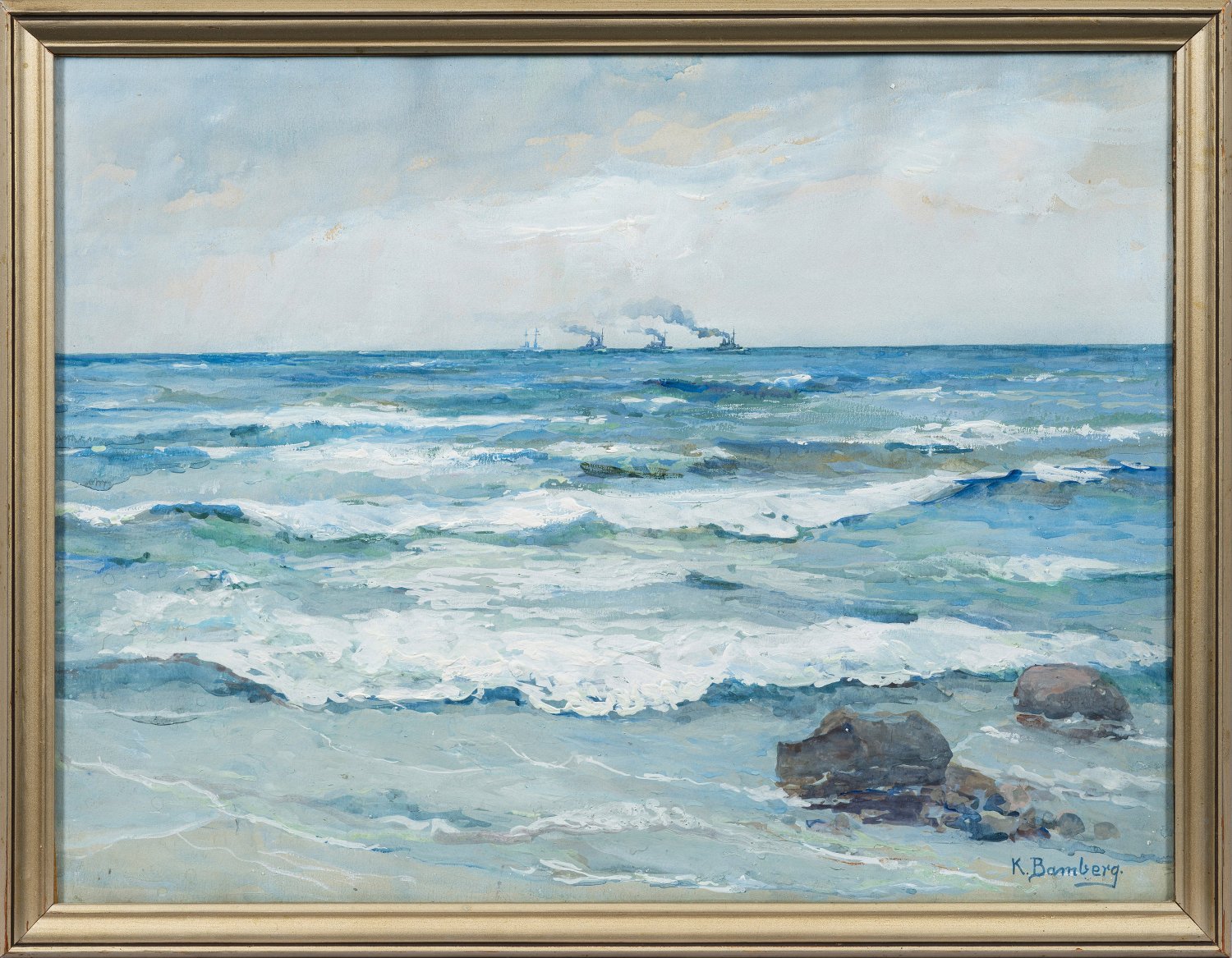 Reizvolle Küstenansicht mit vier Schiffen der kaiserlichen Marine am weit entfernten Horizont. Bamberg war Schülerin bei Ludwig Dettmann in Berlin und unternahm Studienreisen nach Oberbayern, in den Spreewald, nach Bornholm und an die Côte d’Azur. Nachdem sie anfänglich überwiegend Stillleben und Porträts schuf, widmete sie sich bald der Landschaftsmalerei. Ihre Motive fand sie in ihrer norddeutschen Heimat, an der Ostseeküste, auf Rügen, Vilm und Hiddensee. Gouache u. Deckweiß/Papier. R. u. sign.; Blatt ca. 32 cm x 42 cm. Rahmen.