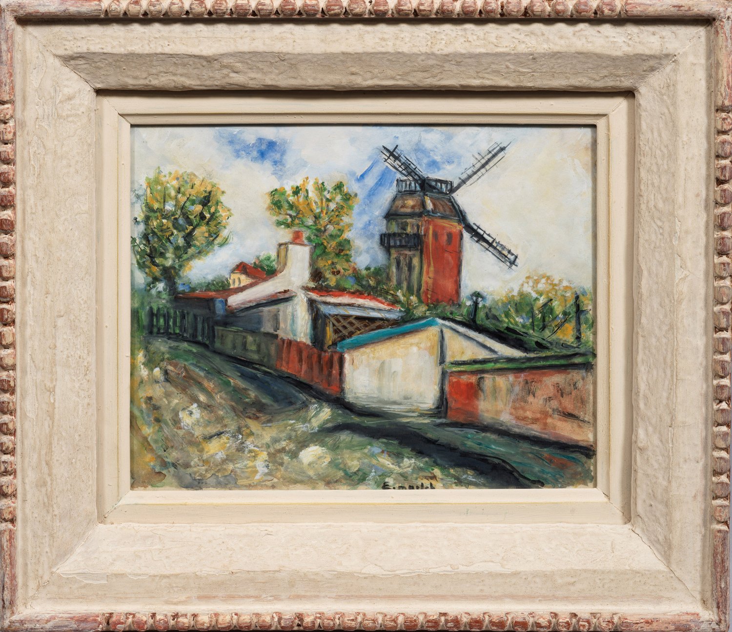 Locker gemalte, sommerliche Pariser Ansicht in Montmartre, wie sie der französische Landschaftsmaler Maclet zahlreich schuf und später auch von Maurice Utrillo als bevorzugtes Motiv gemalt wurde. Mit seinen von der Kunst der Fauves beeinflußten Landschaften, erlangte der Künstler besonders nach 1918 schnell Erfolge und allgemeine Anerkennung. Gouache/Papier. R. u. mittig sign.; Ca. 22 cm x 28 cm. Rahmen.