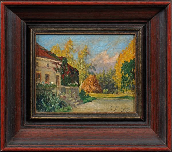 Sommerlich heitere, lichtdurchflutete, duftig locker gemalte Ansicht des von Blüten und Kletterpflanzen umgebenen Herrenhauses im Kreis Stallupoenen mit baumbestandenem, weitläufigem Anwesen. Löbenberg studierte an den Akademien in Königsberg und Berlin und wurde vor allem durch seine herausragenden Tier- und Jagdstücke weithin bekannt. Öl/Lwd., kaschiert auf Karton. R. u. monogr. u. dat. "... (19)21". Rückseitiger Vermerk mit Ortsangabe. Sichtmaß 16,3 cm x 21 cm. Rahmen.