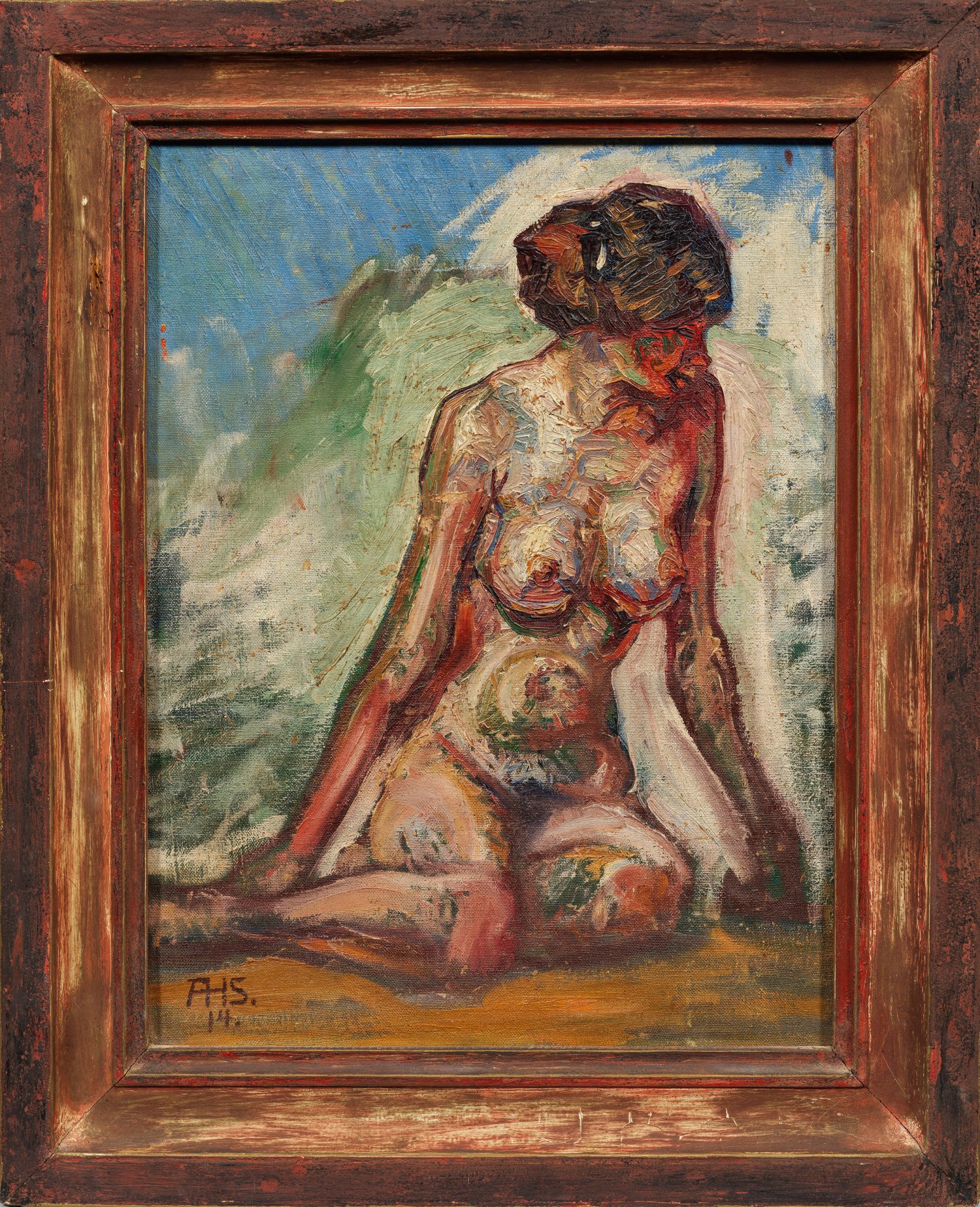 In äußerst kraftvollem, teils stark pastosem Pinselstrich und kräftiger Kontur gemalter, auf dem Boden hockender, weiblicher Akt. Frühe und damit seltene Arbeit Schmidt-Niechciols, dessen Werke unter dem NS-Regime als entartet verfemt und mehrfach beschlagnahmt wurden. Der Künstler studierte zunächst an der Kunstgewerbeschule in Breslau und anschließend 1912-1914 an der Dresdener Akademie bei Eugen Bracht und Richard Müller. 1918 ließ er sich in Worpswede nieder. Öl/Lwd.; L. u. monogr. u. dat. (19)14. Verso bez. "Aktstudie (Dresden, 1914) (/) Arnold Schmidt-Niechciol". 52,5 cm x 40,5 cm. Rahmen.