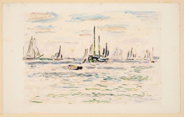 1914 entstandenes, frühes Blatt. Der älteste Sohn von Gerhart Hauptmann studierte u. a. 1909-1912 an der Académie Ranson in Paris. Dort traf er Rilke und Rodin und befreundete sich mit dem Pointillisten Paul Signac. Aquarell u. Bleistift/Papier. R. u. sign. u. dat. 1914. Stockfleckig, im Passepartoutausschnitt leicht gebräunt. Blatt 32,2 cm x 51,5 cm.