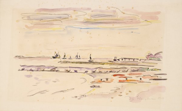Frühes Blatt Ivo Hauptmanns. Der älteste Sohn von Gerhart Hauptmann studierte u. a. 1909-1912 an der Académie Ranson in Paris. Dort traf er Rilke und Rodin und befreundete sich mit dem Pointillisten Paul Signac. Aquarell u. Bleistift/Papier. R. u. sign. u. dat. 1915(?). Stockfleckig, im Passepartoutausschnitt leicht gebräunt. Blatt 32,2 cm x 51 cm.