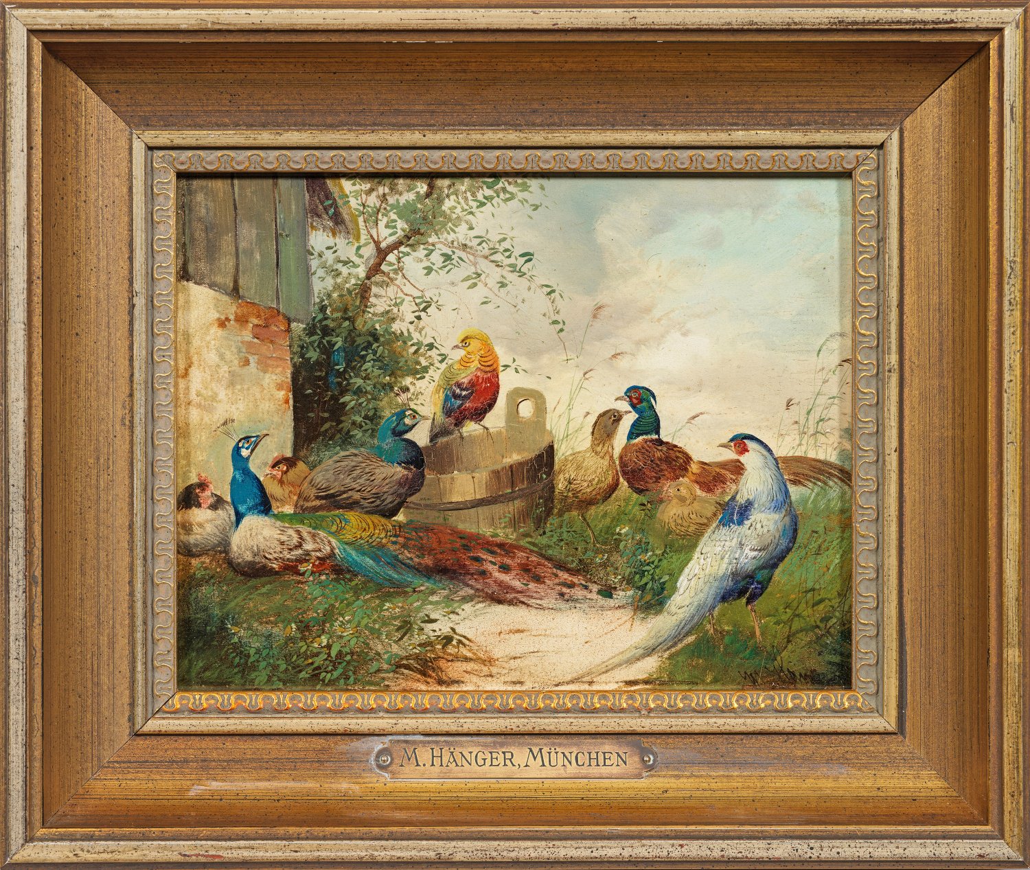 Gegenstücke. Motiv- und stiltypische Werke Max Hängers, der mit Vorliebe in feinmalerischer Weise eingehend studierte, ländliche Vogelmotive schilderte und die Tiere hierbei naturgetreu und lebendig wiedergab. Öl/Holztafel. Jeweils sign., einmal Ortsangabe M(ün)ch(en). 15,8 cm bzw. 16 cm x 20,8 cm. Rahmen.