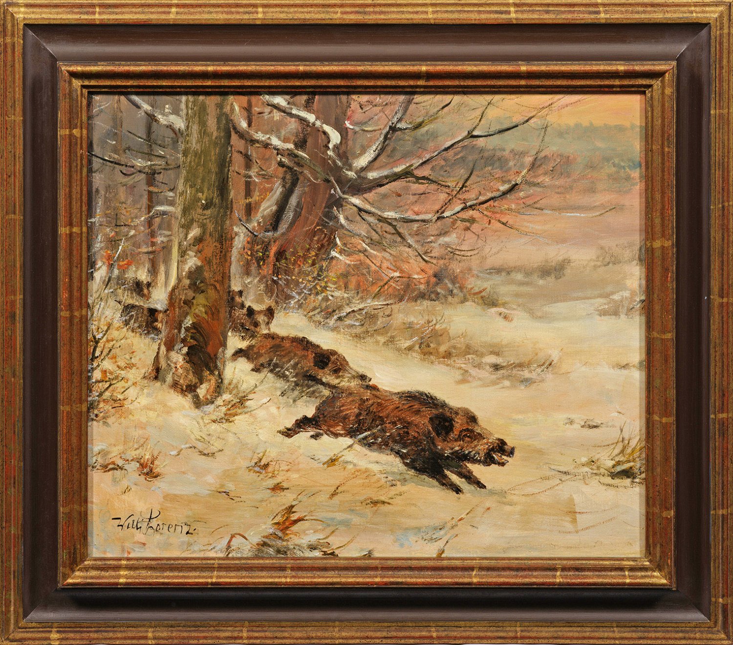 Mit weich-pastosem Duktus gemalte Darstellung des bekannten Jagd- und Tiermalers. Lorenz schilderte mit Vorliebe die einheimische Fauna (Schwarz- und Rotwild), die er in naturnahen, lebendigen Darstellungen wiedergab. Öl/Lwd.; L. u. sign.; 50,5 cm x 60 cm. Rahmen.