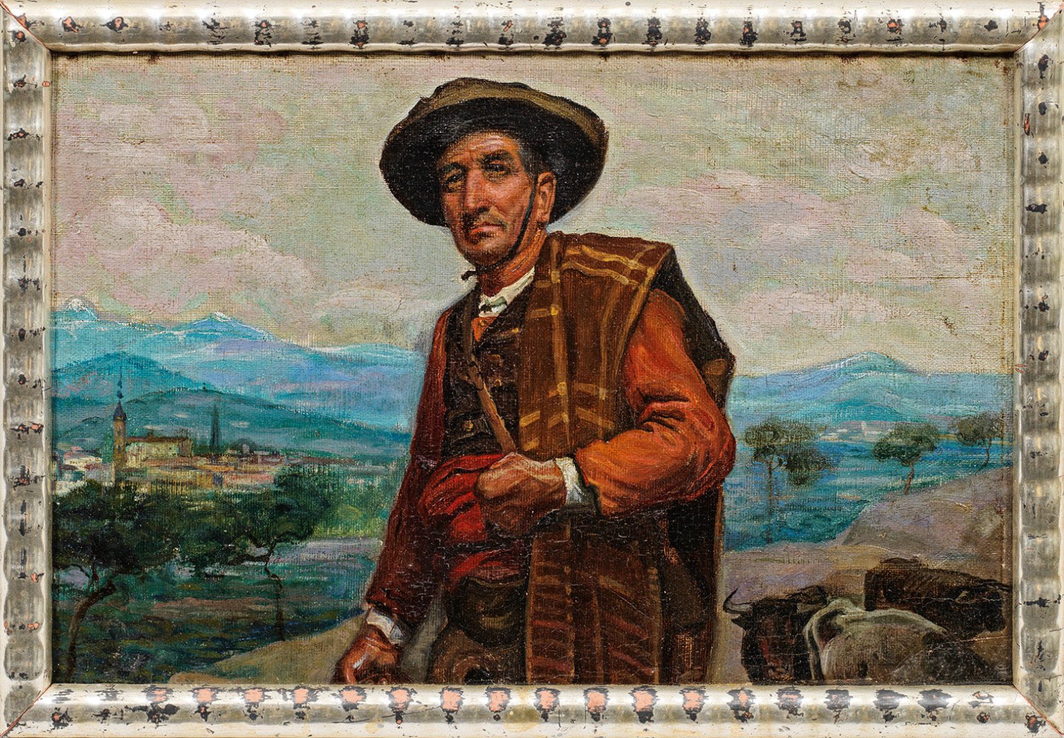 Realistische, ausdrucksvoll charakterisierende Darstellung des dominant im Vordergrund stehenden Gauchos als Halbfigur, neben ihm im Mittelgrund mehrere Rinder, im Hintergrund die Stadt Mendoza und schneebedeckte Gipfel der Anden. Öl/Lwd.; Verso undeutl. bez.; 25 cm x 39 cm. Rahmen.