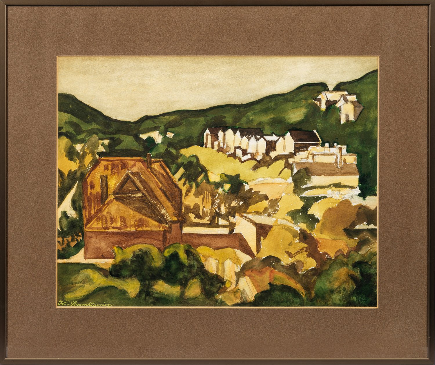 Dynamische, flächig angelegte Komposition Sramkiewiczs, vermutlich angelegt als Vorstudie eines Gemäldes. Aquarell und Bleistift/Bütten. L. u. sign.; 35 cm x 45 cm. Rahmen.