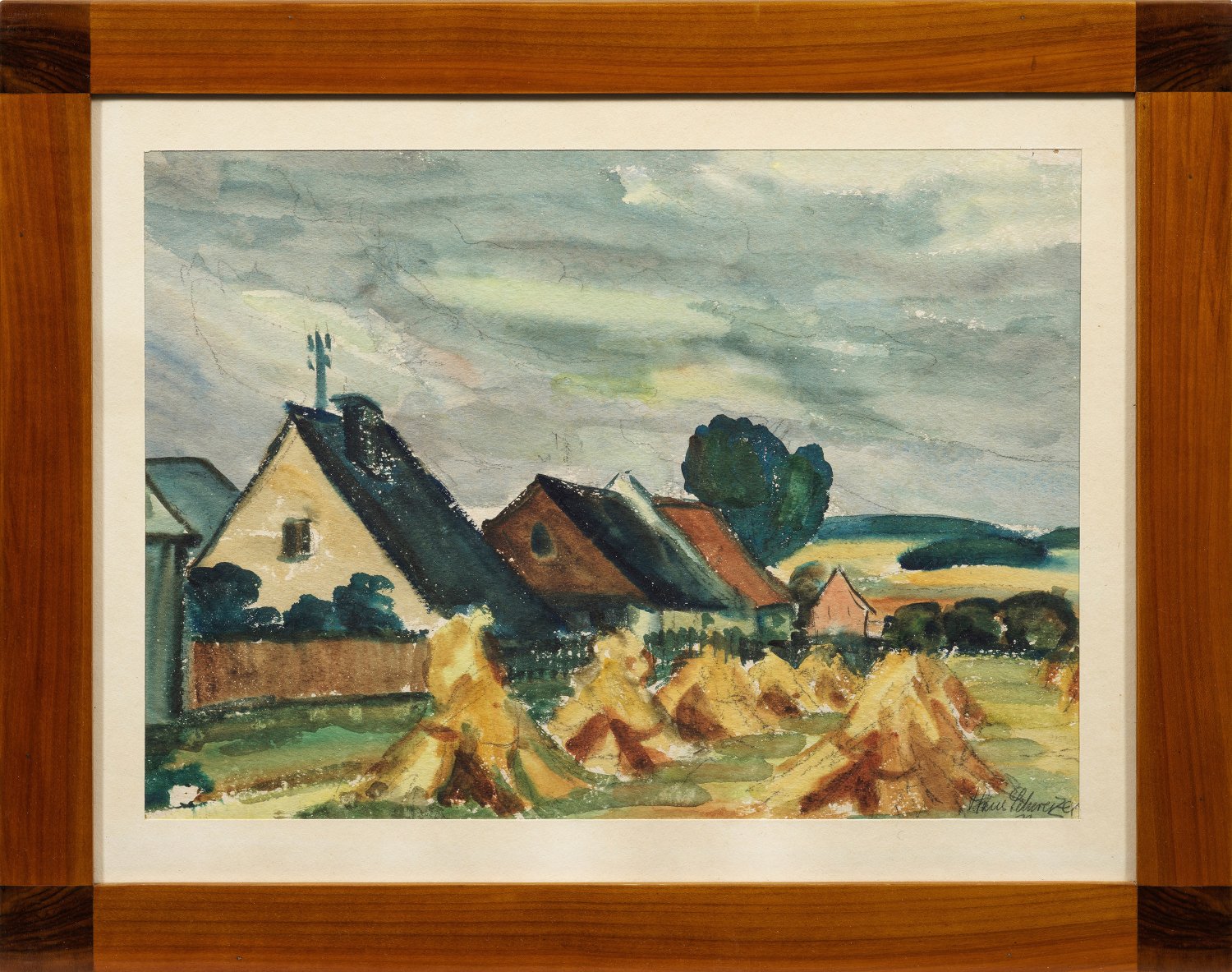 Blick auf ein Dorf mit Getreidegarben. Der Maler und Bildhauer studierte an der Werkkunstschule Offenbach am Main sowie 1949-1952 an der Kunstakademie Düsseldorf bei Josef (Sepp) Mages und an den Kölner Werkschulen. Aquarell über Bleistift/"Schoeller-Parole"-Papier. R. u. sign. u. dat. (19)73. Blatt 38 cm x 49,5 cm. Furnierter Rahmen im Biedermeier-Stil.