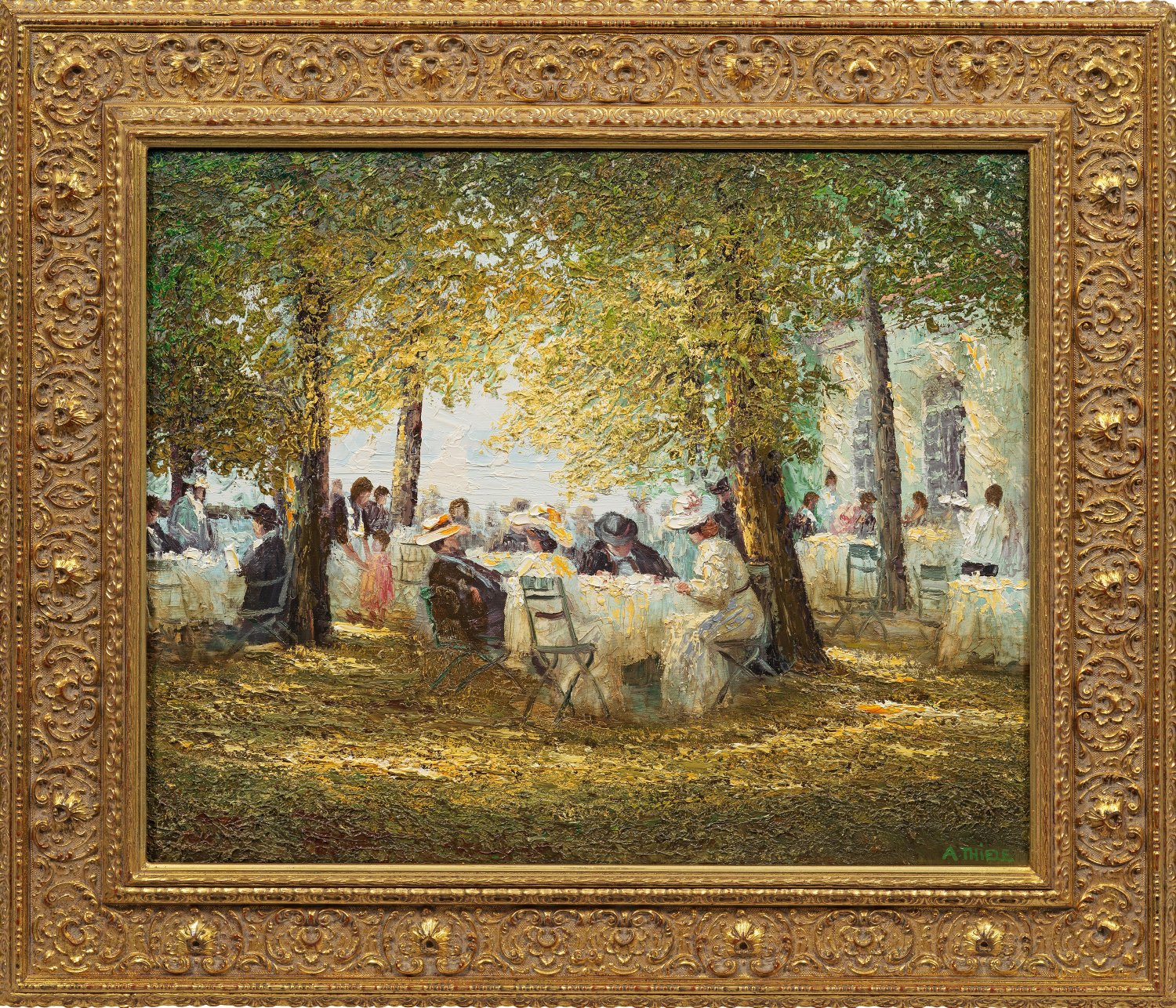 Im impressionistischen Stil gemalte, nostalgische Cafégärten aus der Zeit um 1900 sind ein charakteristisches Motiv Alexander Thieles. Im vorliegenden Gemälde wird die Stimmung eines warmen, sonnigen Sommertages am Berliner Wannsee durch flirrende Lichteffekte und einen pastosen Farbauftrag wiedergegeben, wobei im Vordergrund das Licht durch das Laub der Linden bis auf den Boden fällt. Öl/Lwd.; R. u. sign.; Verso betitelt. 50 cm x 60 cm. Rahmen.