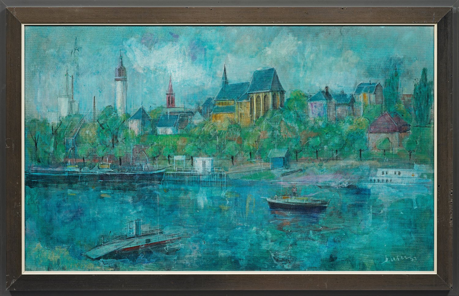 Blick über den Main auf die Altstadt von Frankfurt-Höchst mit dem Turm des Höchster Schlosses und der mittelalterlichen Justinuskirche. Moderne Stadtvedute Klebers, der an der Städel-Schule in Frankfurt studierte. Außer Darstellungen der Höchster Altstadt und vom Mainufer schuf er Ölgemälde mit Darstellungen von Frankfurt und vom Frankfurter Römer, vom Odenwald, Spessart und Taunus, aber auch Industriebilder. Öl/Lwd.; R. u. sign. u. dat. (19)71. Verso nochmals sign. (oder bez.), betitelt u. dat.; 60 cm x 100 cm Rahmen.