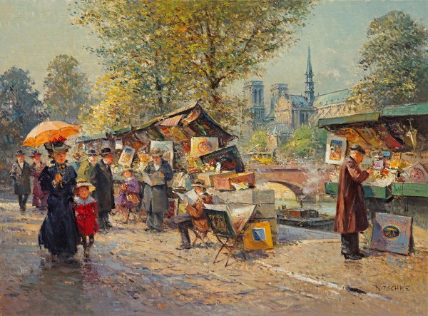 Vielfigurige Szene aus der Zeit um 1900. Im Hintergrund Notre Dame. Nitschke malt mit Vorliebe nostalgische Veduten, Straßen-, Café-, Biergarten- und Parkszenen in den europäischen Metropolen der Belle Epoque bzw. Kaiserzeit, welche die unbeschwert heitere, atmosphärische Stimmung und das pulsierende großstädtische Leben jener Jahre wiedergeben. Öl/Lwd., auf MDF-Platte kaschiert. R. u. sign.; 33 cm x 45 cm.