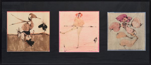 Ins Grotesk-Komische verzogene Darstellungen der bedeutenden Zeichnerin, Grafikerin und Illustratorin, die 1956 nach Mainz kam und dort seit 1966 als freischaffende Künstlerin arbeitet. 1968 erhielt sie den Grafik-Biennale-Preis in Kraków/Polen, weitere Auszeichnungen folgten. Feder u. Aquarell/Papier. Jeweils sign. u. dat. (19)69. Ca. 29,5 cm-31,5 cm x 28,5cm-31,5 cm (Passepartoutausschnitt). Im Sammelrahmen.