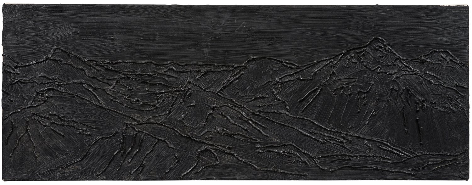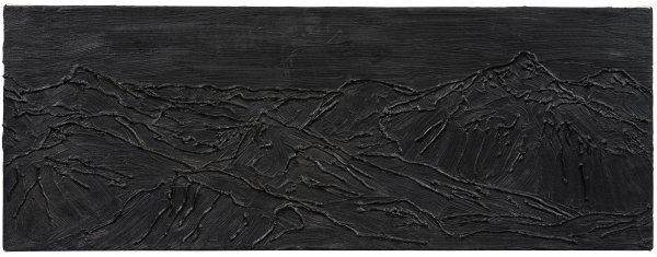 Komplett in schwarz gehaltene Komposition, die eine Gebirgslandschaft durch reliefartige Konturlinien assoziiert. Absolut reduzierte Arbeit Drühls aus der Werkreihe "Undead-Paintings", in denen der Künstler kunsthistorische Vorlagen lediglich in Schwarz mit einer erhabenen Konturlinie zitiert und damit von dem ursprünlichen Bildkontext loslöst. Öl und Silikon/Lwd.; Verso sign., betitelt, dat. 2006, bez. EA sowie mit Widmung "Für Oliver (/) Glückwunsch zur Professur". 30 cm x 80 cm.