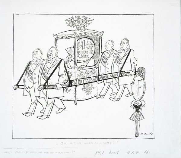 Über 40 Blätter mit Zeichnungen, insbesondere von Peter Rudolf Leger (1924 - 1991), meist politische Karikaturen für Tageszeitungen wie die HAZ. Unterschiedliche Techniken und Formate - Feder, teilw. mit Weißhöhungen, Bleistift u. Kugelschreiber. Größtenteils monogr. "PL" (für Peter Leger) und "H. E. K." bzw. sign. "Till". Ca. 5 cm-36,5 cm x 7,5 cm-42 cm.