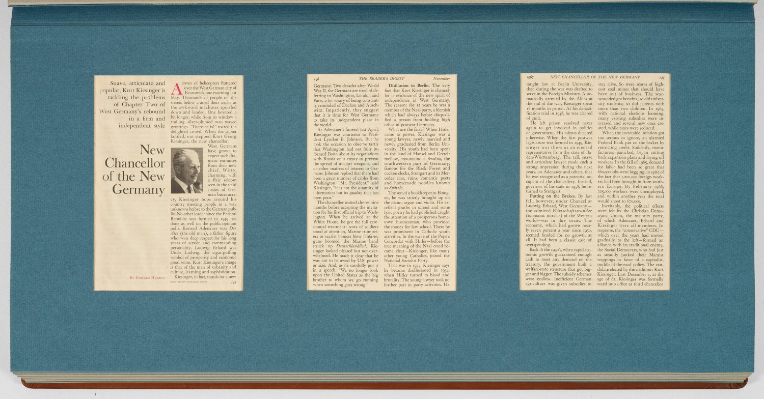A leather bound album and box with international press reports from "Reader's Digest" about the appointment of Kurt Georg Kiesinger (1904 - 1988) as chancellor of the Federal Republic of Germany in 1966.